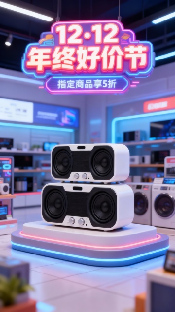 赛博朋克风3D场景,霓虹灯效渲染,重拟物设计突出音箱质感,未来感科技空间搭配促销信息,营造12·12年终好价节狂欢氛围。