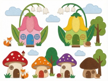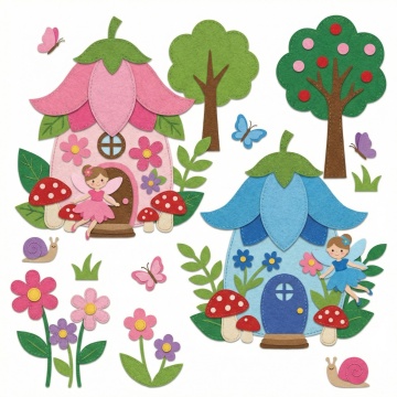 六个不同旅行主题的毛毡材质卡通元素集合,每个元素都有圆润的造型和可爱的表情,色彩鲜艳明快,主色调为黄色、蓝色、橙色和绿色,元素之间留有适当空白,整体呈规整排布。第一个元素是黄色旅行巴士,车顶上放着橙色行李箱,旁边有绿色的草地和小路;第二个元素是蓝色的飞机,机翼上有白色的云朵图案;第三个元素是橙色的行李箱,上面系着粉色的蝴蝶结;第四个元素是蓝色的自行车,车轮是黑色的,车座是棕色的;第五个元素是粉色的热气球,下面有一个黄色的篮子;第六个元素是绿色的地图,上面有红色的路线标记和黄色的指南针。所有元素都具有柔软的毛毡质感,边缘有明显的缝线,光影柔和,高光部分呈圆形,阴影自然过渡。