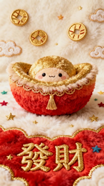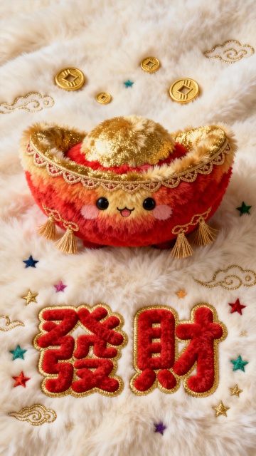 国潮风毛绒金元宝拟人设计,刺绣质感“发财”字样,搭配金币与祥云点缀,喜庆可爱,充满节日氛围。