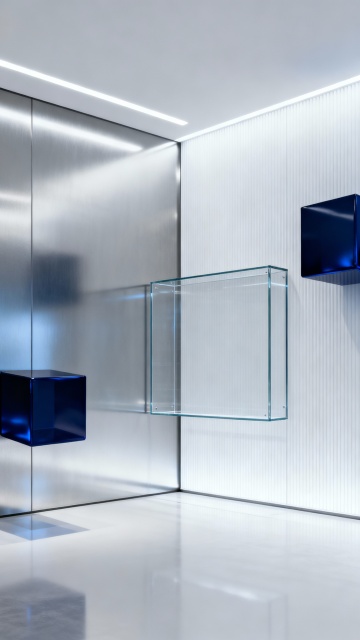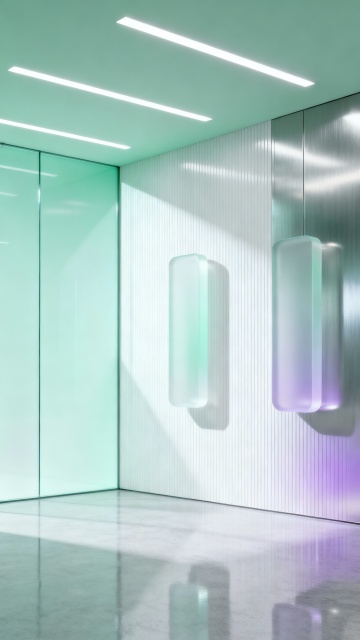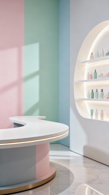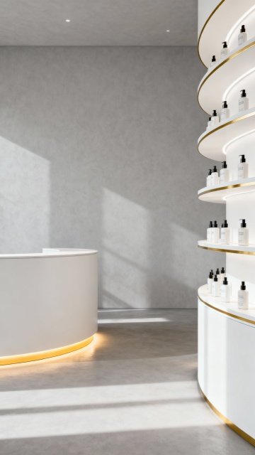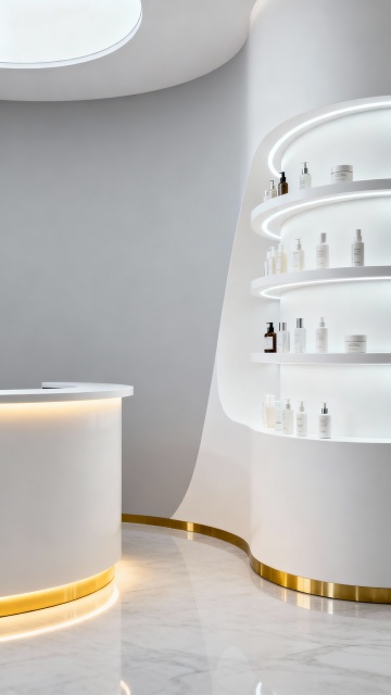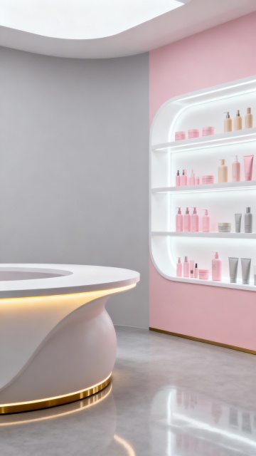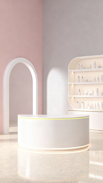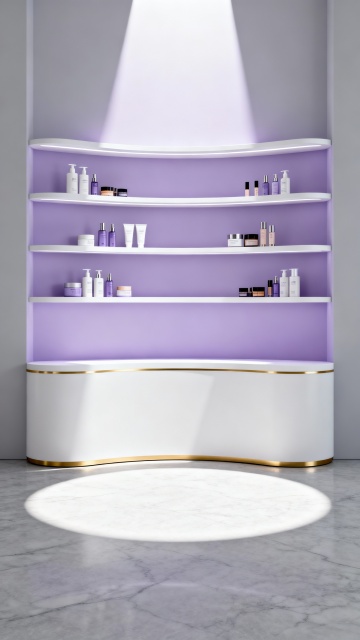 极简主义风格的直播间背景,柔和的莫兰迪粉紫色调,整体空间以流畅的弧形线条构成,左侧是一个巨大的白色拱形背景墙,下方连接着带有金色灯带装饰的白色弧形前台,右侧是多层白色弧形置物架,上面整齐摆放着各种瓶罐状的护肤品,地面为光滑的浅色大理石材质,光线明亮柔和,从顶部均匀洒下,营造出宁静、优雅、高端的氛围,无任何文字元素。