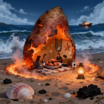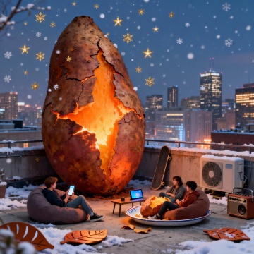 焦褐色的巨型烤红薯化身为一座奇妙的林中书屋,外皮自然开裂形成门窗,内部透出温暖的橙光,散发着焦香与书香。书屋内部墙壁是红薯果肉般的温暖质感,书架嵌在其中,一家人坐在低矮的书堆旁分享知识和热腾腾的红薯,书本垒成的矮桌上放着茶杯,墙面壁灯是老式油灯造型,角落留声机播放舒缓古典乐。外部是静谧的覆雪森林,巨大书本造型石凳和羽毛笔状雕塑散落林间,光秃树枝挂着冰凌,雪花被窗口暖光染上知识的温度,整体氛围温馨梦幻,细节丰富,光影层次感强