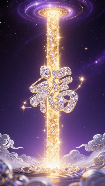 鎏金3D大字搭配璀璨钻石边框,浮雕质感与星光点缀营造奢华梦幻氛围,紫金配色尽显喜庆暴富主题。
