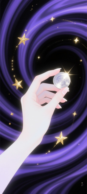 梦幻紫漩涡中,轻拟物手握鎏银币,星轨环绕,粒子闪烁,插画风呈现唯美元素,优雅感十足,适配节日庆典主题。