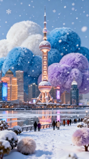 梦幻雪境中的巴黎,埃菲尔铁塔矗立于毛绒云朵与飘雪之间,软3D风格融合插画风,温馨可爱,浪漫满溢,虚拟现实感十足。