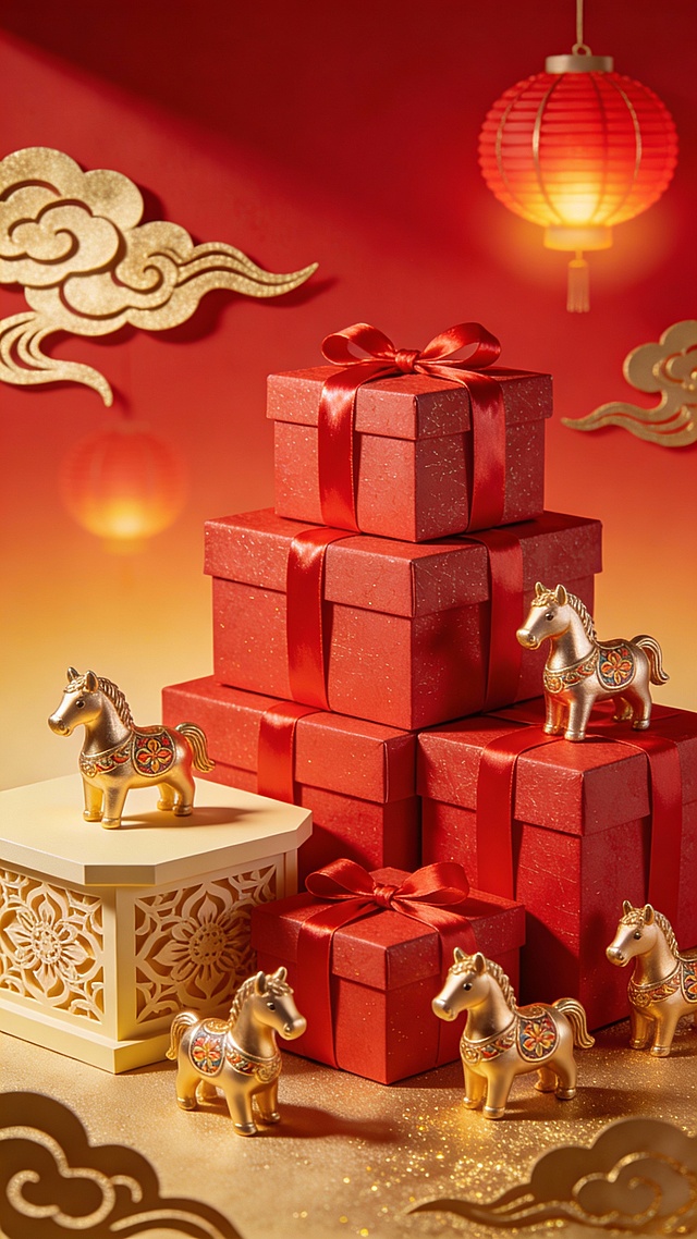 红色麻将随意堆叠成创意展台,主体摆放在麻将展台上(主体占画面比30%,正面视角),红金渐变背景(“福利加马”鎏金字体对联点缀,虚化),自然光影,高饱和喜庆感配色,保证溶图效果。详情