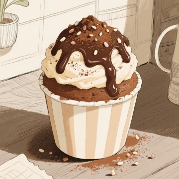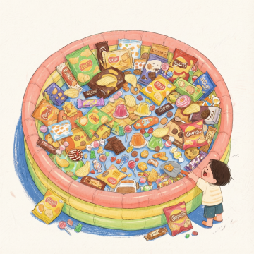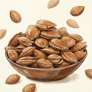 手绘风格插画,一个白色的陶瓷盘子里装满了金黄色的爆米花,爆米花颗粒饱满,有些微微爆开,盘子边缘有简单的花纹装饰,背景是浅米色,整体画面温暖可爱,充满手绘的笔触质感