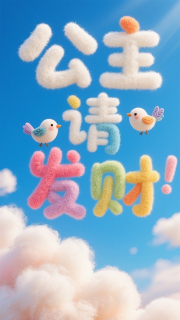梦幻毛绒字体搭配萌趣小鸟,软3D粘土风呈现可爱卡通感,蓝天白云背景营造童话氛围,传递新春发财祝福。