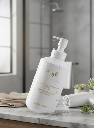 极简现代风洗发露,液态质感瓶身搭配柔和光影,清新绿植点缀浴室场景,传递清爽舒适与性冷淡美学。