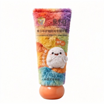 彩虹毛绒质感牙膏管,拟人萌牙形象跃然其上,插画风与动漫风结合,柔软舒适触感,梦幻色彩传递童趣与呵护,专为青少年设计。