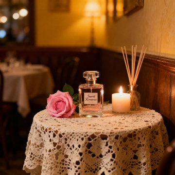 复古暖光下,刺绣桌布上的玫瑰与香水瓶交织出浪漫温馨的轻拟物风场景,玻璃质感与烛光相映,营造优雅实景感。