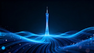 深蓝色并带有从弱到强光感的光纤形态的抽象图形围绕着图片的底部,带有细微光点,画面的中心点有由光纤所衬托出的广州塔,图形以深蓝至黑色的渐变为主要颜色,整体呈现科技感与神秘感,深邃夜空般的色彩层次,平滑流动的曲线设计,无文字元素