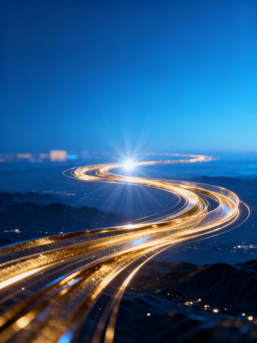 深邃科技感蓝色渐变背景,画面底部由多条发光蓝色线条汇聚成螺旋状光轨,光轨上点缀着大小不一的白色光点,上部是流动的半透明蓝色光带,整体呈现出速度感与未来科技氛围,光影层次分明,色彩以深蓝、湖蓝、浅蓝渐变融合,营造出神秘而充满动感的宇宙空间或高速穿梭的科技隧道视觉效果。