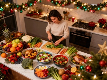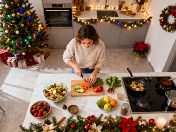厨房场景,一堆新鲜的水果、蔬菜和沙拉摆在台面上,一位外国女人靠左边正在切蔬菜,周围有圣诞氛围装饰,如圣诞彩灯、圣诞花环、小型圣诞树等,整体色调温馨明亮,细节丰富,高清晰度