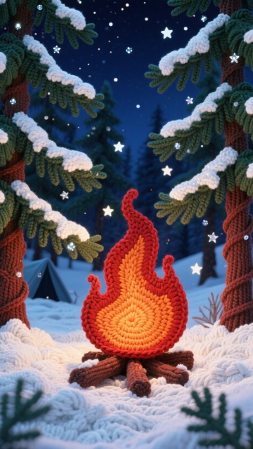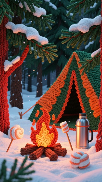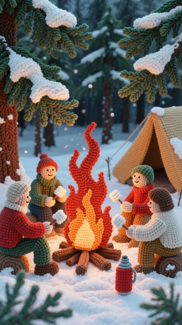 毛线编织的冬日露营场景,拟人化小人围坐篝火烤棉花糖,温暖治愈。微缩艺术风搭配卡通感设计,展现温馨可爱的节日氛围。