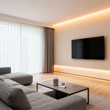 现代简约风格客厅,融合科技感智能中控与质朴木纹材质,光影交错间展现轻拟物设计美学,营造舒适温馨的居家氛围。