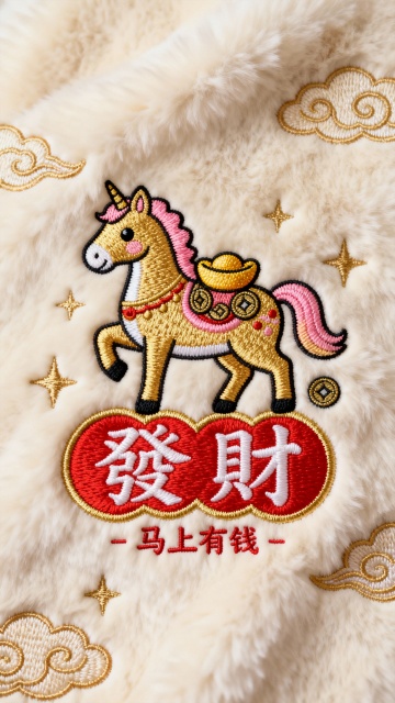 一幅以发财为主题的毛绒质感刺绣壁纸,整体采用红色绒布料为背景,主体是一只色彩鲜艳的敦煌壁画风格的白色骏马,并点缀金、粉色渐变装饰,马的脚下绣有元宝、铜钱等元素。下方是红色的“马上发财”四字,采用圆润可爱的字体,非书法体,边缘绣金色的轮廓线。文字周围小标题“万事如意”。点缀金色的祥云、星星等元素。