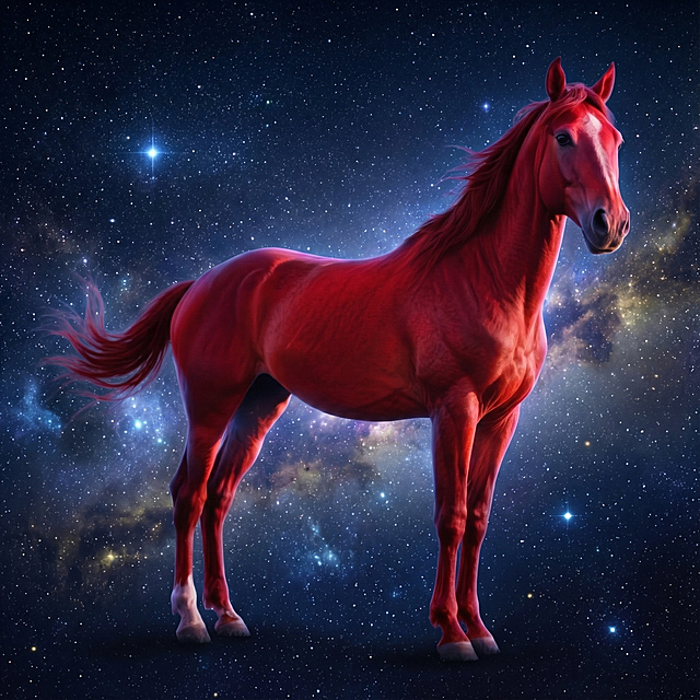 梦幻感与未来感交织的星空马,融合油画风与粒子风,厚涂技法呈现神秘唯美的虚拟自然,光影流动中透出科技感与体积感,背景红金漩涡呼应节日喜庆氛围。详情