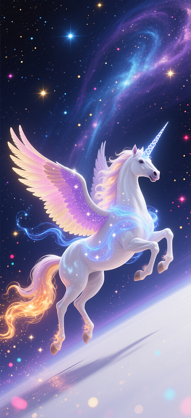 梦幻感与唯美感交织的3D插画风,透明玻璃质感的天马踏云而行,星光粒子环绕,超现实主义呈现神圣与浪漫的宇宙奇景。详情