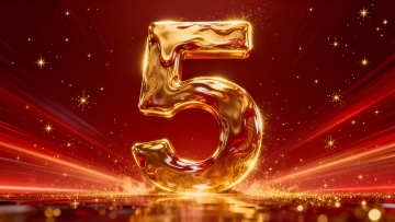 巨大的金色数字“5”的气球,可爱玩具元素悬浮在周围,暖色调,生日氛围,红色背景
