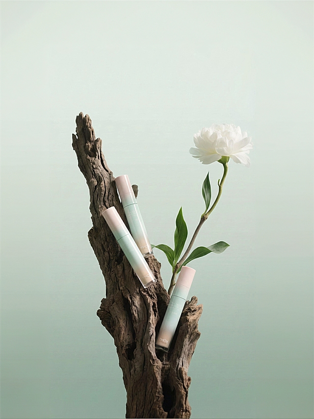 一瓶精华的特写,玻璃台子,背后是一片动态模糊有残影的竹子,淡绿色渐变背景详情