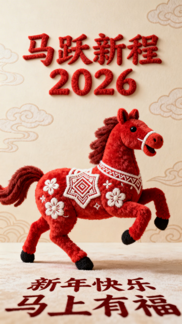 软3D毛绒马形象,融合国潮刺绣元素,喜庆红白配色,毛发生长质感,卡通可爱风,传递2026新年祝福。