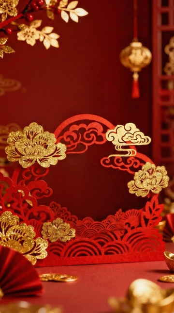 中式喜庆风格,鎏金3D立体“發”字辉映红底,搭配浮雕质感金元宝与铜钱,毛绒装饰点缀,尽显奢华重拟物风,传递新春财运亨通之寓意。