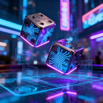 赛博朋克风3D金属骰子悬浮于霓虹光影中,电路纹路与虚拟现实界面交织,未来感十足,科技与酷炫并存。