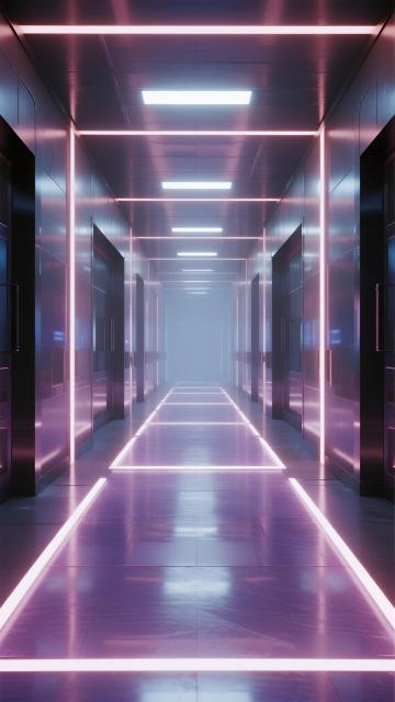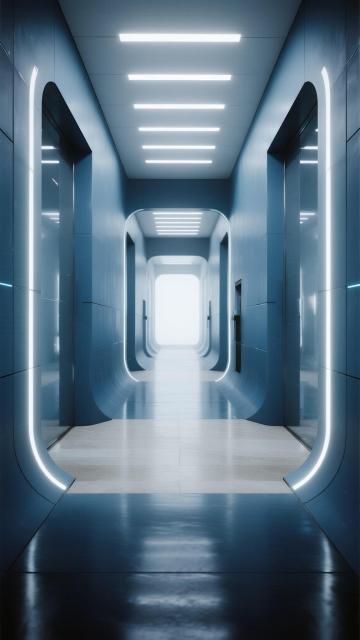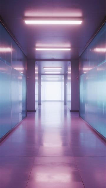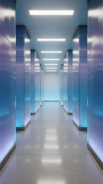 一个极简风格的未来感室内空间,墙面由光滑的银白色金属板和带有垂直细条纹的白色面板构成,地面是反光的浅灰色光滑材质,顶部有嵌入式的白色条形灯光,光线柔和且均匀地照亮整个空间。左侧墙面原本放置图表的位置现在是一块纯净的透明玻璃板,没有任何图案或文字,右侧金属板墙面保持光滑无缝的质感,同样不包含任何文字信息。墙面上点缀着两个悬浮的、具有半透明磨砂质感的长方体装饰物,整体色调改为以柔和的薄荷绿为主,辅以浅灰色和少量的淡紫色渐变,营造出清新、宁静且科技感十足的氛围,光线从顶部条形灯和墙面间接反射,形成微妙的光影层次和柔和的阴影过渡,整个空间简洁、通透,充满现代设计感。