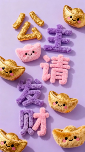 粉嫩毛绒质感搭配鎏金元宝与刺绣“发财”字,融合国潮风与轻拟物设计,营造甜蜜喜庆的中式节日氛围。