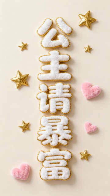 毛绒质感的“公主请暴富”字体,搭配金色描边与粉色爱心、闪亮星星,呈现柔软梦幻的刺绣风设计,营造甜蜜可爱的节日氛围。