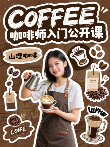 卡通感插画风,扁平拼贴设计,大字标题突出,趣味清新兼具时尚感,咖啡主题元素环绕,传递轻松愉悦的节日氛围。