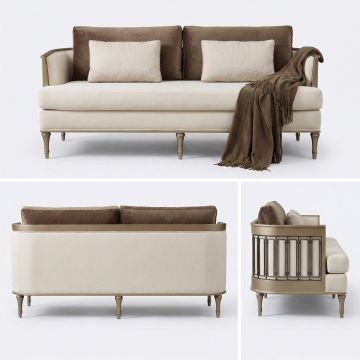 一张高品质家具产品展示海报,白色简约背景,上下两行对齐排列共4个不同设计的沙发。第一行左侧是米白色亚麻布艺三人沙发,带有两个方形靠垫,实木细腿;第一行右侧是深灰色绒布双人沙发,低矮扶手,金属圆柱形支撑脚。第二行左侧是焦糖色皮革单人沙发椅,弧形靠背,黄铜包边装饰;第二行右侧是天蓝色丝绒贵妃榻,流线型设计,带金属支架。所有沙发均采用3D渲染效果,表面有细腻的材质纹理和柔和光影,高光处有轻微反光,阴影自然过渡,整体呈现现代简约风格,视觉层次清晰,信息传达直接,突出家具的质感与设计感。