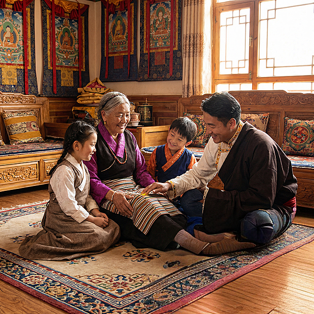 黄昏光影中,母女身着刺绣华服,手持经幡与酥油灯,行于布达拉宫前,民族感与神圣感交融,中式古典美学尽显优雅与厚重。详情