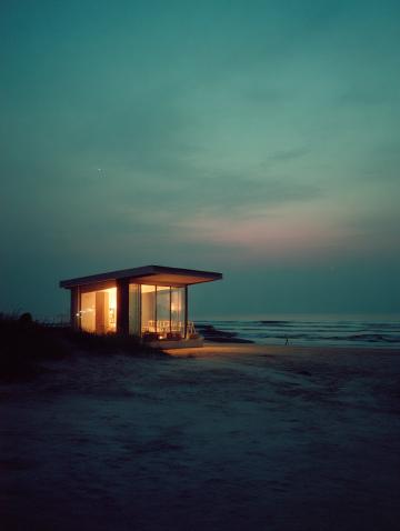 俯视角构图,金色黄昏下的热带海湾,渐变的橙粉天空中悬浮着棉花糖般的云层,海面被染成琥珀色与靛蓝交织的绸缎,近处的浅滩上散落着半埋沙中的彩色贝壳和一个倒扣的藤编野餐篮,篮子边缘垂落着一条红白条纹的棉布餐布,三个不同尺寸的草帽随意堆叠在餐布上,远处海平面上一艘挂着橙帆的小渔船正缓缓归航,岸边的棕榈树群在沙滩上投下细长摇曳的影子,几只白鹭单脚站立在退潮后的礁石上,空气中漂浮着细小的金色尘埃,整体色调温暖而梦幻,光影柔和过渡,构图充满生活气息与度假的慵懒感。
