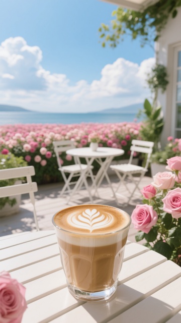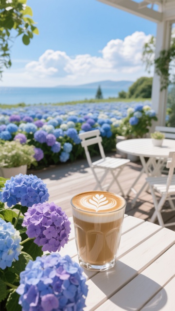 温暖治愈的午后阳光透过窗户洒在木质桌面上,形成斑驳光影,一杯拉花精致的拿铁咖啡置于白色瓷杯碟中(近景),桌上一罐银色illy咖啡罐,还有一本翻开的书,背景是在室内一大片大朵的蓝色、深蓝色、蓝紫色、淡紫色的绣球花,还有绿意盎然的滴水观音等室内植物,一整面白色边框的超大玻璃窗外是飘着一大片云朵的蔚蓝天空,整体呈现柔和的暖色调,光线柔和有光晕效果,营造出咖啡屋惬意的下午茶氛围。