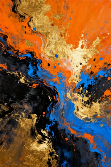 一幅充满动感与活力的抽象色彩流体艺术作品,整体呈现出浓厚的油画质感,色彩以深邃的靛蓝色为背景,中央及下方区域由炽热的橙红色、明亮的金黄色和清新的青蓝色相互交融、流淌、扩散,形成强烈的视觉冲击力和层次感,色彩过渡自然且富有张力,笔触厚重而奔放,呈现出颜料在画布上肆意挥洒的流动感和随机性,光影效果柔和,高光部分主要集中在色彩交汇的明亮区域,营造出温暖而热烈的氛围,画面构图饱满,色彩元素充满整个空间,展现出色彩的极致碰撞与融合之美。
