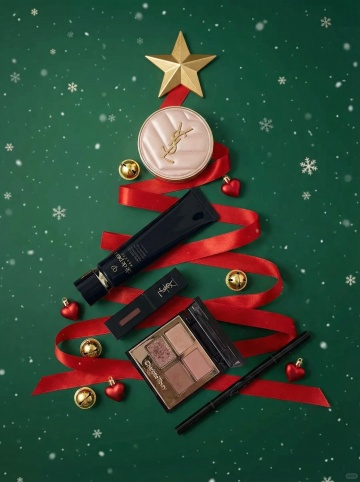 圣诞树造型的彩妆拼贴,红绿双色设计,丝绒质感与金属光泽交织,营造奢华喜庆氛围,浪漫唯美中透出时尚感。