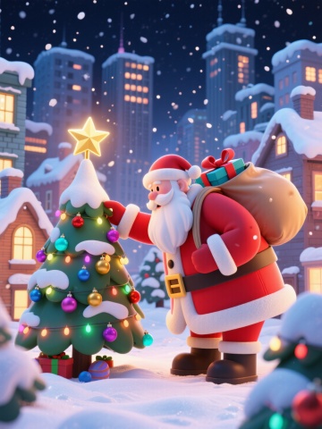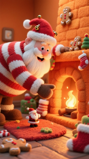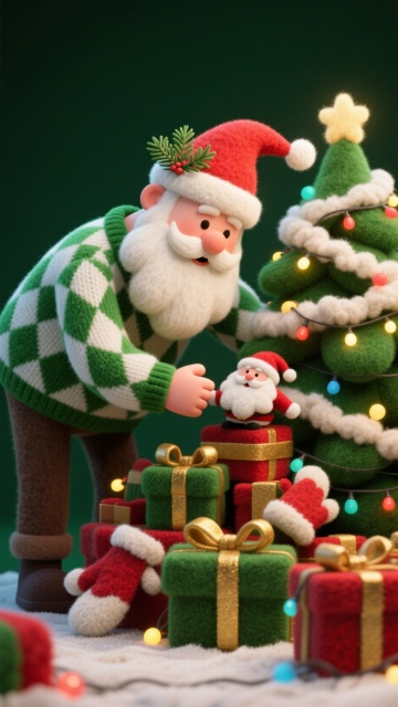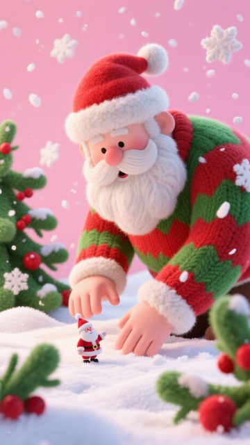 软3D粘土风格,卡通圣诞老人与迷你雪橇上的小圣诞人互动,蓝色毛线雪橇、飘雪与铃铛营造温馨喜庆氛围,充满可爱与趣味感。