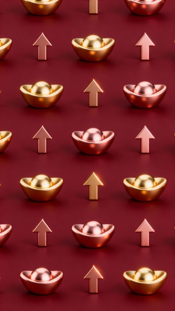 鎏金风3D重拟物设计,红底金元宝与美元币穿插粉色箭头,喜庆奢华兼具商务质感,象征财富增长。