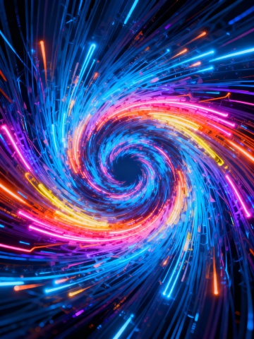 深蓝色渐变背景上,由无数发光的蓝色线条和光点构成的螺旋状漩涡图案,线条呈现出流畅的动态感并向中心汇聚,中心有明亮的蓝色光晕向外辐射,整体画面充满强烈的科技感与金属光感,线条边缘带有细腻的高光效果,营造出深邃而神秘的宇宙科技氛围,视觉上具有强烈的动感和空间纵深感。