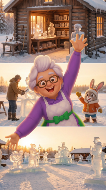 卡通感与3D风结合,拟人化的兔角色在雪屋中创作冰雕,重拟物风格呈现细腻质感,光影与体积感营造温馨梦幻的冬日场景。