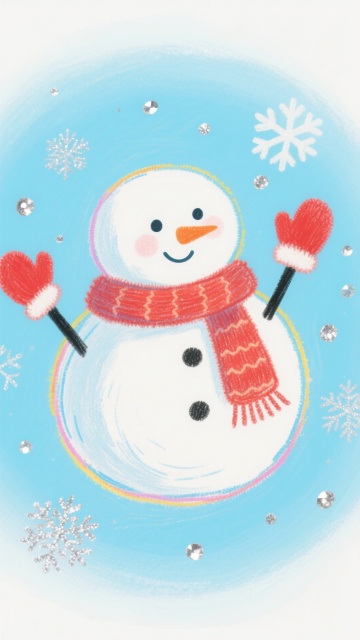 可爱卡通雪人,拟人化设计,蜡笔风与水彩风结合,描边柔和,背景飘雪点缀,充满温馨梦幻的圣诞氛围。