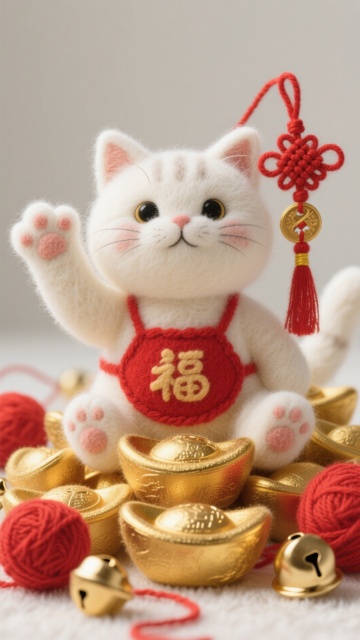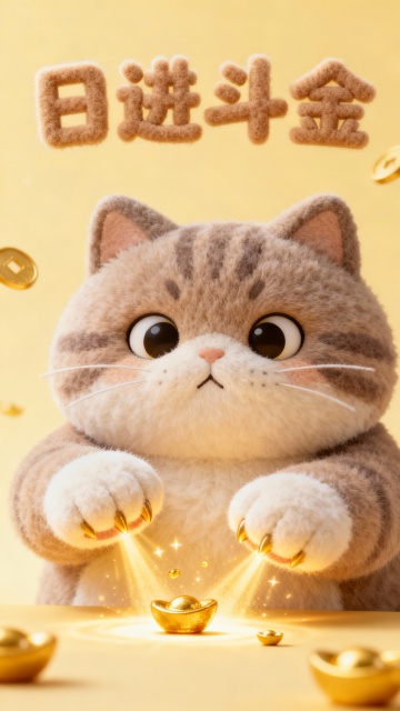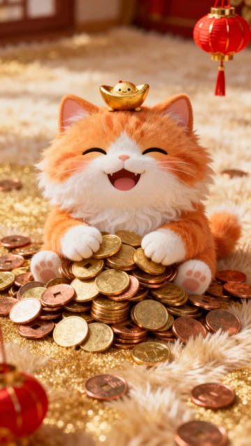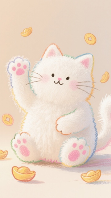 可爱插画风格,画面中心是一只胖乎乎的招财猫,浑身雪白的绒毛柔软蓬松,粉色的耳朵和脸蛋肉嘟嘟的,十分俏皮。它正举着一个写着“發”的小红牌,小红牌边缘用金色线条勾勒,“發”字是童趣的手写体,颜色鲜艳。周围漂浮着几个元宝,元宝金光闪闪,仿佛在传递着财富的喜悦。背景是柔和梦幻的淡紫色,上面点缀着一些大小不一的白色星星和粉色爱心,营造出干净可爱的氛围,整个画面充满了萌趣与美好的寓意。
