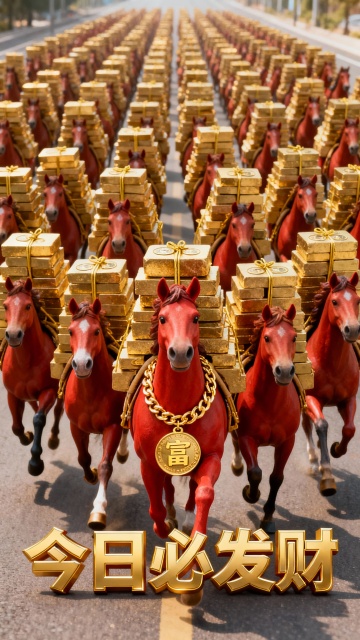 未来感与科技感交织的3D重拟物机械金马,鎏金金属质感搭配虚拟现实光效,立于莲花基座,寓意“马上生财”,奢华大气,尽显新年贺岁风尚。
