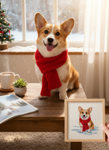 一只可爱的柯基幼犬,棕白相间的毛发蓬松柔软,大大的耳朵竖起,黑色的圆眼睛明亮有神,小鼻子湿润,嘴巴微微闭合,前爪放在身前,坐在不同的生活场景中,如温馨的客厅地毯上、阳光明媚的窗台边、铺着格子餐布的餐桌旁,背景根据场景相应变化,保持自然柔和的光线,整体画面清新治愈,充满生活气息。