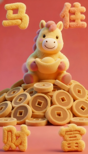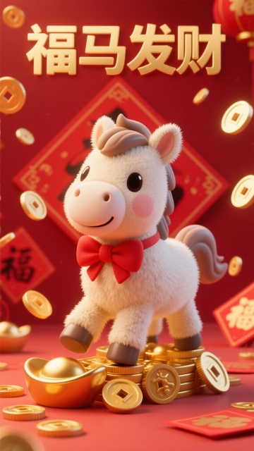 软3D卡通小马搭配刺绣风“招财进宝”牌匾,毛发生长质感与浮雕云纹背景交织,国潮风浓郁,喜庆可爱,金元宝与福字点缀,节日氛围满溢。