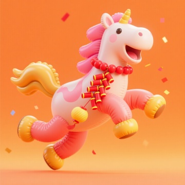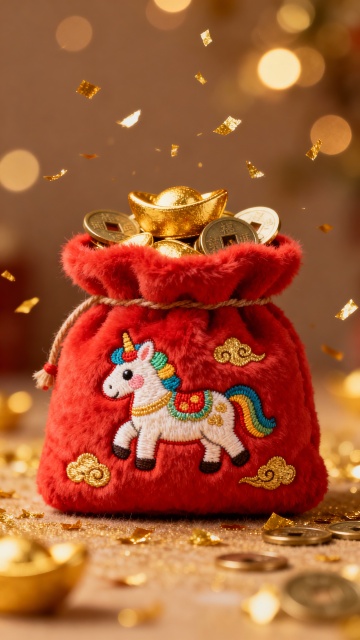 软3D风格的可爱独角兽,毛发生长质感细腻,手持金元宝,搭配刺绣风文字“财运亨通”,营造梦幻温馨的节日氛围。