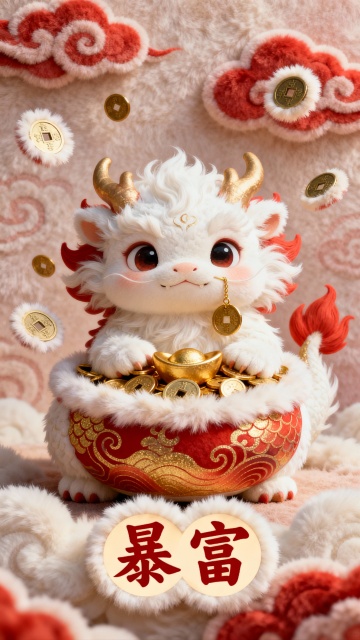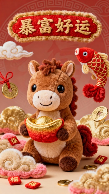 国潮风软3D卡通马抱金元宝,毛发生长质感搭配刺绣浮雕云纹,喜庆红金配色,祥云锦鲤环绕,传递新年暴富好运。