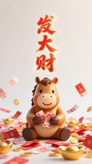 软3D风拟人小马手持红包,环绕金元宝与钞票,鎏金文字“发大财”点缀,喜庆卡通感十足,节日氛围浓厚。