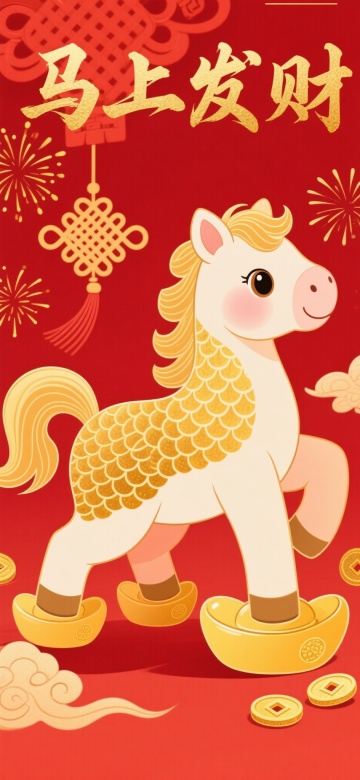 软3D风卡通小马拟人化设计,手持红包与金元宝,搭配鎏金文字“发大财”,营造喜庆可爱的新春氛围。